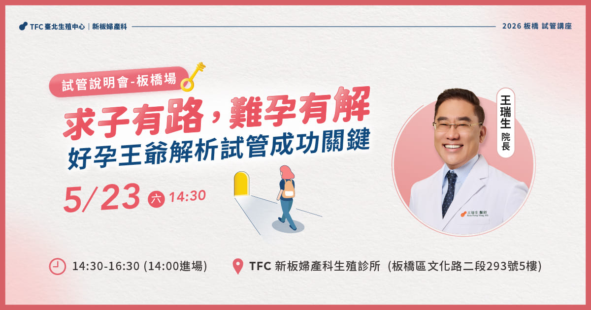 本場 TFC 新板試管說明會,特別邀請有「好孕王爺」之稱的王瑞生院長 親自分享,帶您解析 試管嬰兒療程成功的關鍵。