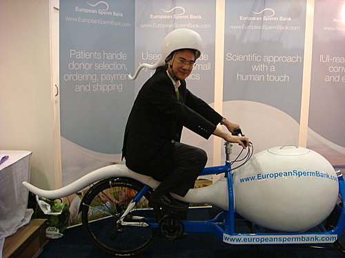2011 ESHRE最後一天,好不容易抽空看看廠商展示時,很無辜地被一家「歐洲精子銀行」說服去試騎他們的腳踏車,當然,我與這家精子銀行沒有任何關係,也沒為他們代言,很多開會的醫師都和我一樣感到好玩新奇而去騎了一下。