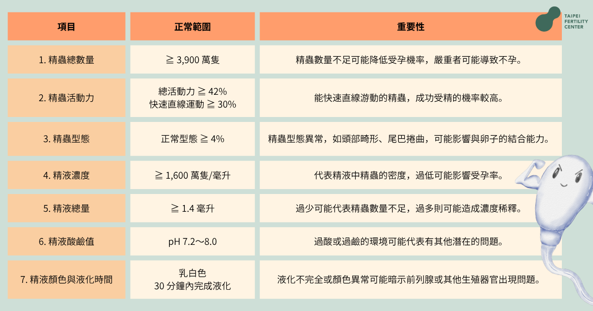 - 精子濃度:每毫升精液中至少含有 1,600 萬隻精蟲。